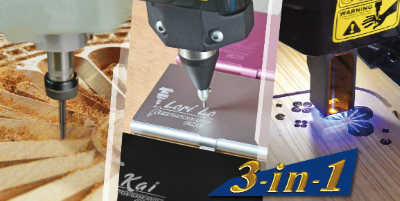 安全面、集塵面、騒音面に配慮しフルフェイスカバーを搭載、尚且つヘッドを交換することで、1台で切削工具によるルーター、レーザー、ドットピーン、3種の加工が可能です(3 in 1)。