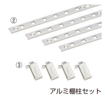 ●棚板、アルミ棚柱、棚受、棚ズレ防止パーツ、各取付ねじが1梱包にまとめられています。